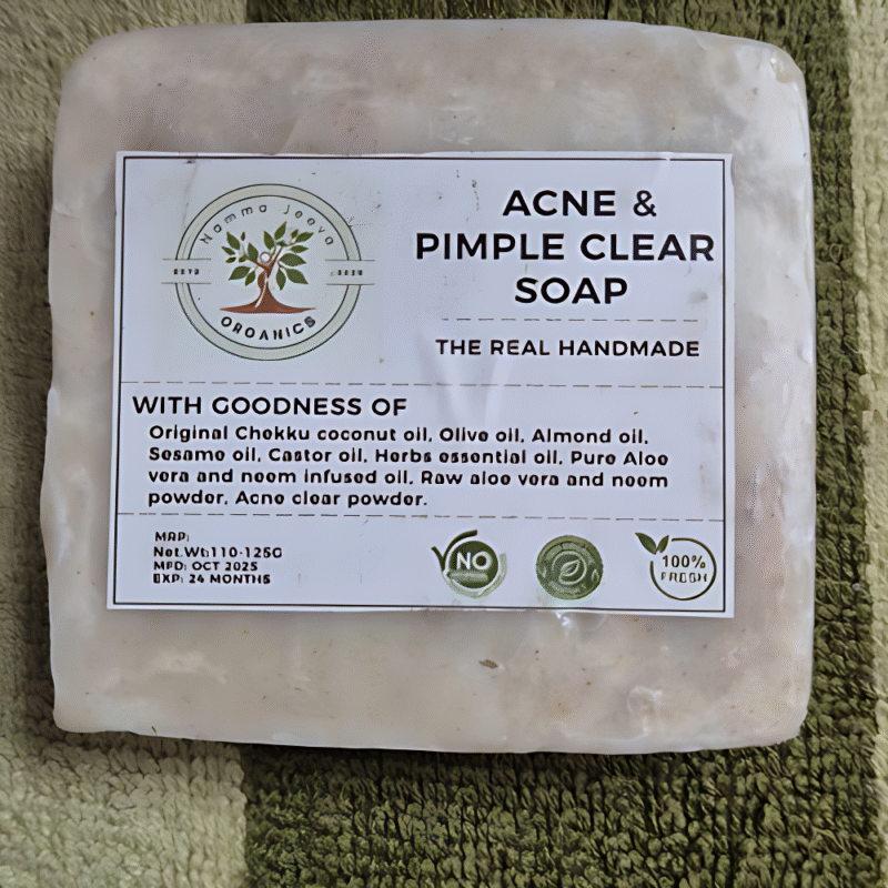 An Acne & Pimple Clear Soap is a cleansing bar formulated to deeply clean the skin, helping remove excess oil, dirt and impurities that clog pores and cause breakouts. It often contains antibacterial or anti-inflammatory ingredients (like aloe vera, tea tree, salicylic acid or other acne-fighting agents) that help reduce acne-causing bacteria, calm redness and irritation, and prevent new pimples from forming. With regular use, it helps clear existing blemishes, fade post-acne marks, control oily skin, and leave skin feeling clean, refreshed, and less prone to breakouts.